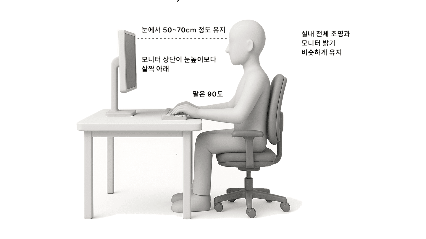 모니터 높이: 모니터 상단이 눈높이보다 약간 아래에 있어야 합니다. 눈을 살짝 아래로 뜨게 되면 안구 표면이 공기에 노출되는 면적이 줄어들어 안구건조증 완화에 도움이 됩니다.